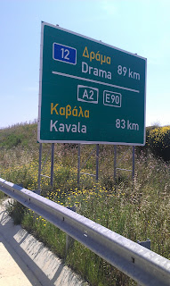 The weather was fantastic and clear blue skies, but when I cycled out of the shade of the buildings the sun was baking hot. It was a busy place Thessaloniki, and getting out of town was busy too. I eventually, get to the motorway and my thoughts are - Can I cycle along here ? Well, it's a really great road surface probably matching western european roads for smoothness, and after the initial climb out of the centre the motorway is very flat, and continues to be like this all morning with only a few gradual climbs.